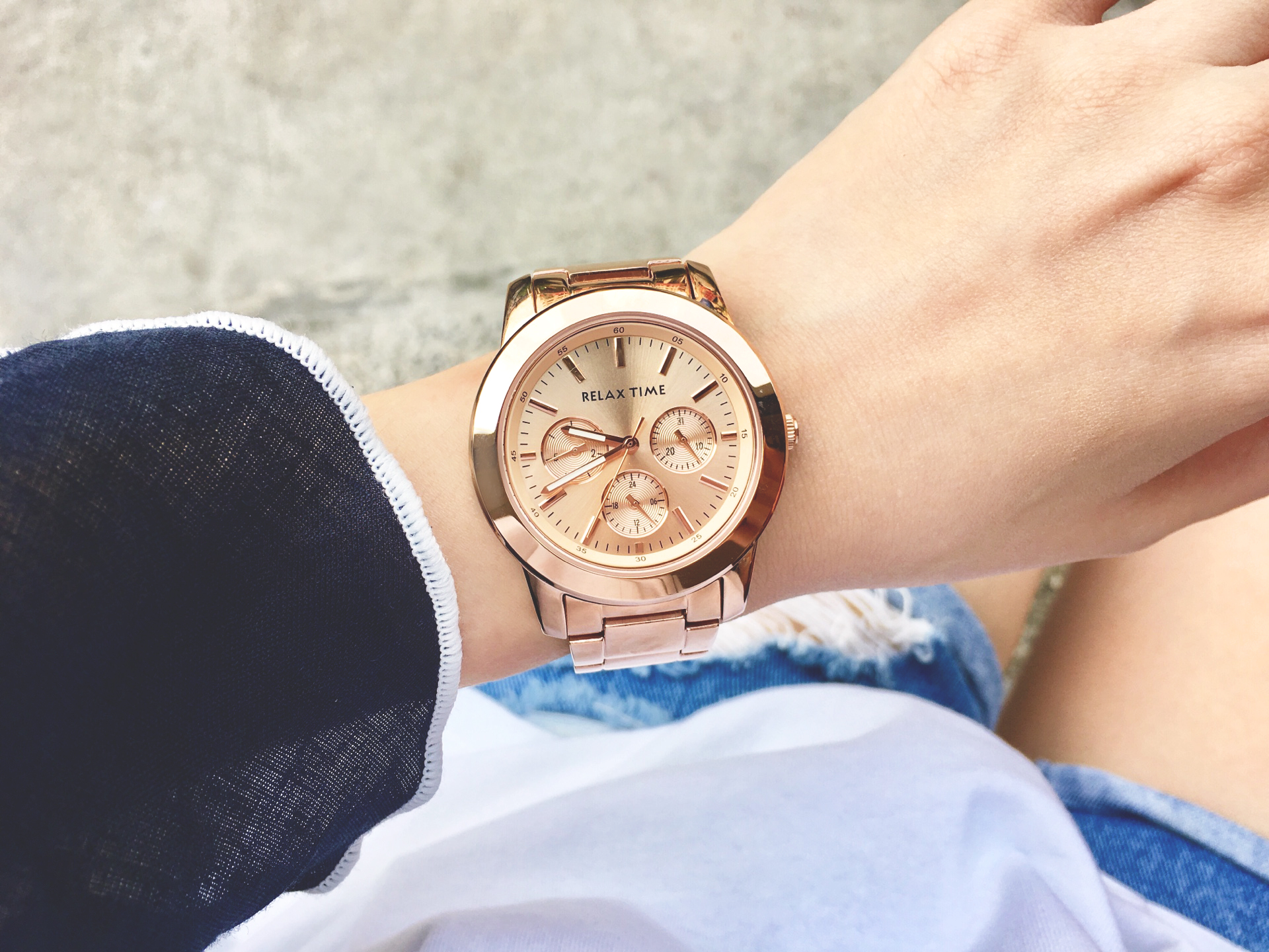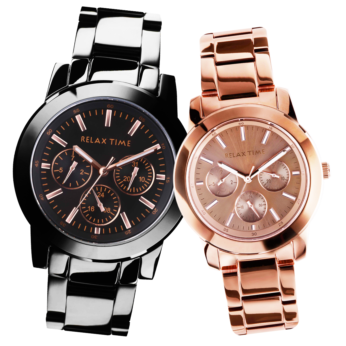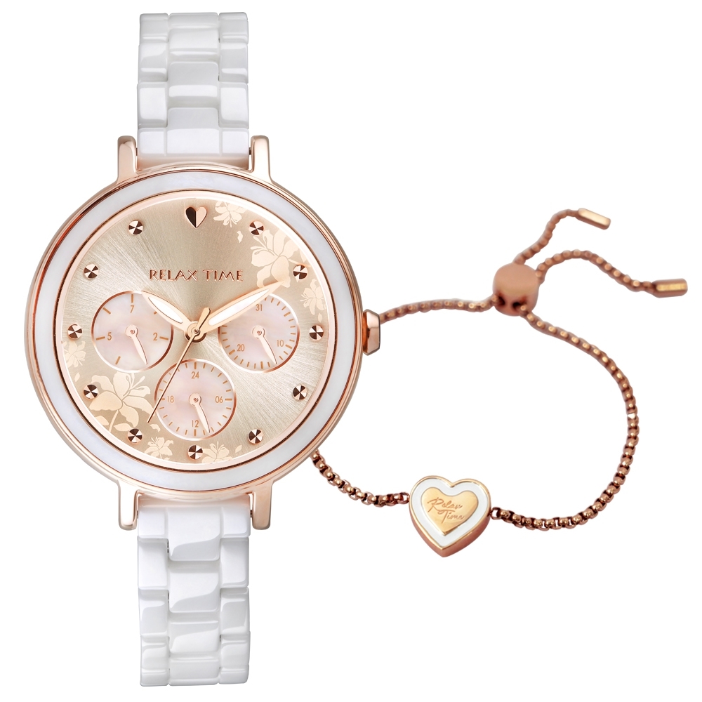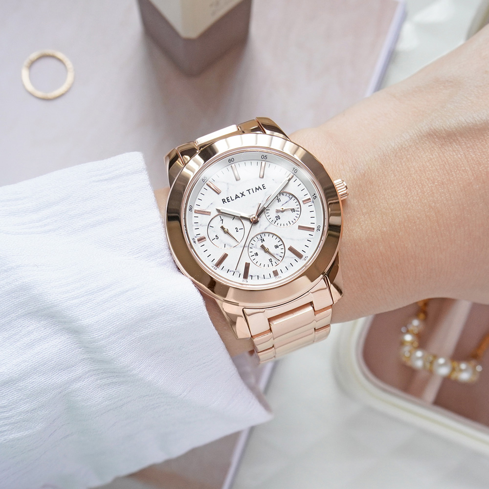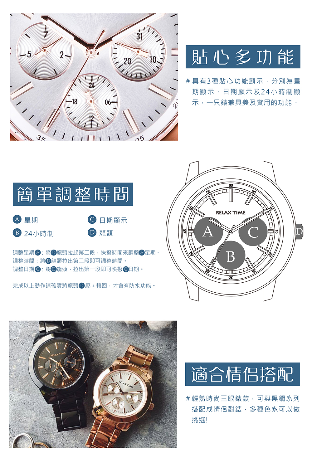 實用三眼錶款 (星期/日期/24H 顯示) 搭配玫瑰金色調