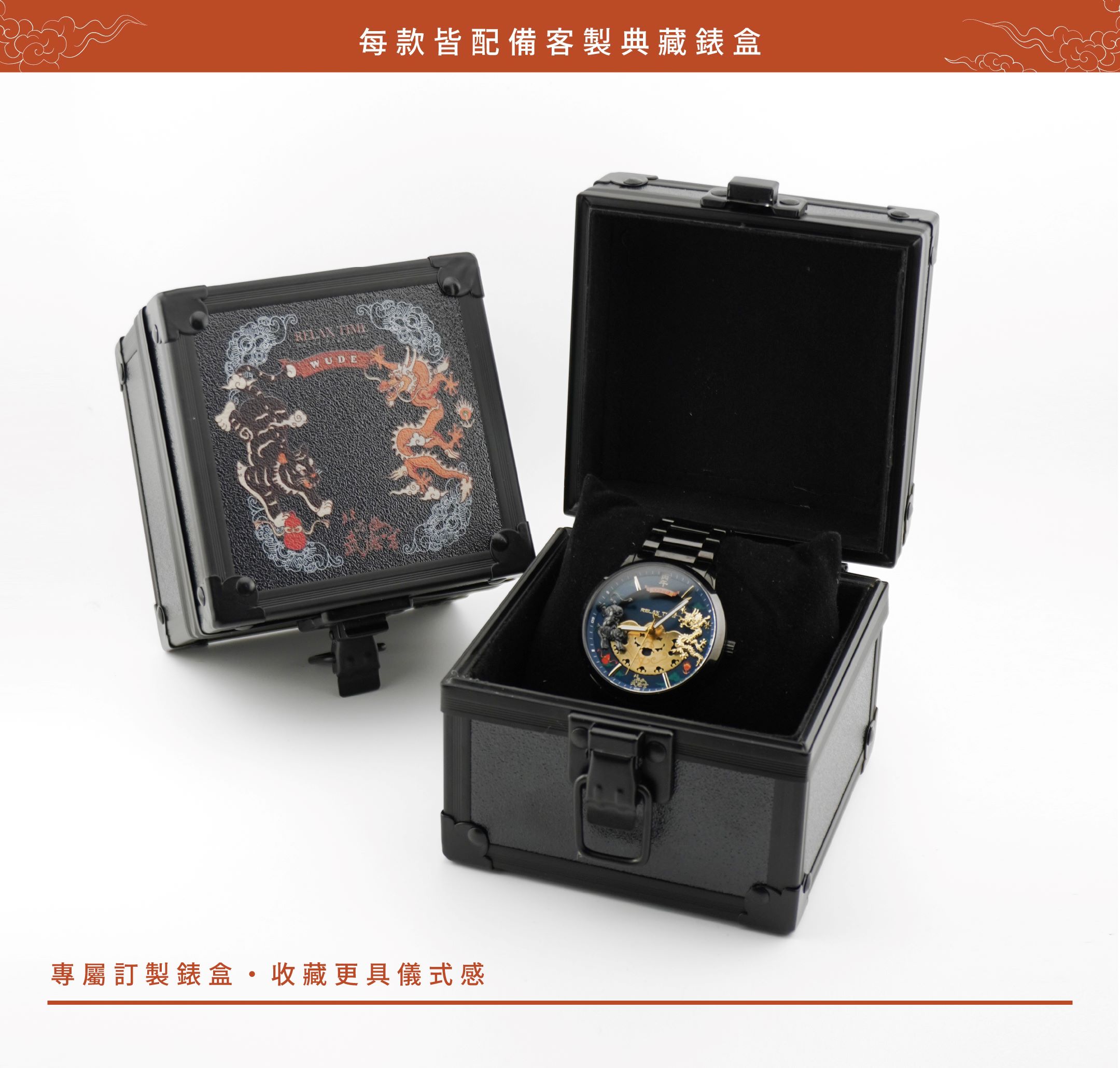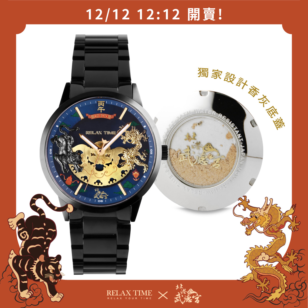 RELAX TIME 攜手臺灣財神開基祖廟-北港武德宮 以「時來運轉,虎您旺財|福氣滿載迎新年」 為主題打造全系列最潮流的聯名錶款!讓你福氣一整年! - 手錶的轉動, 象徵著時間的流逝與循環, 呼應「時來運轉」的美好寓意。 而北港武德宮為全台信眾無數的財神祖廟, 香火鼎盛、財氣凝聚的氣場, 為這份「運轉」注入了最強大的祝福。