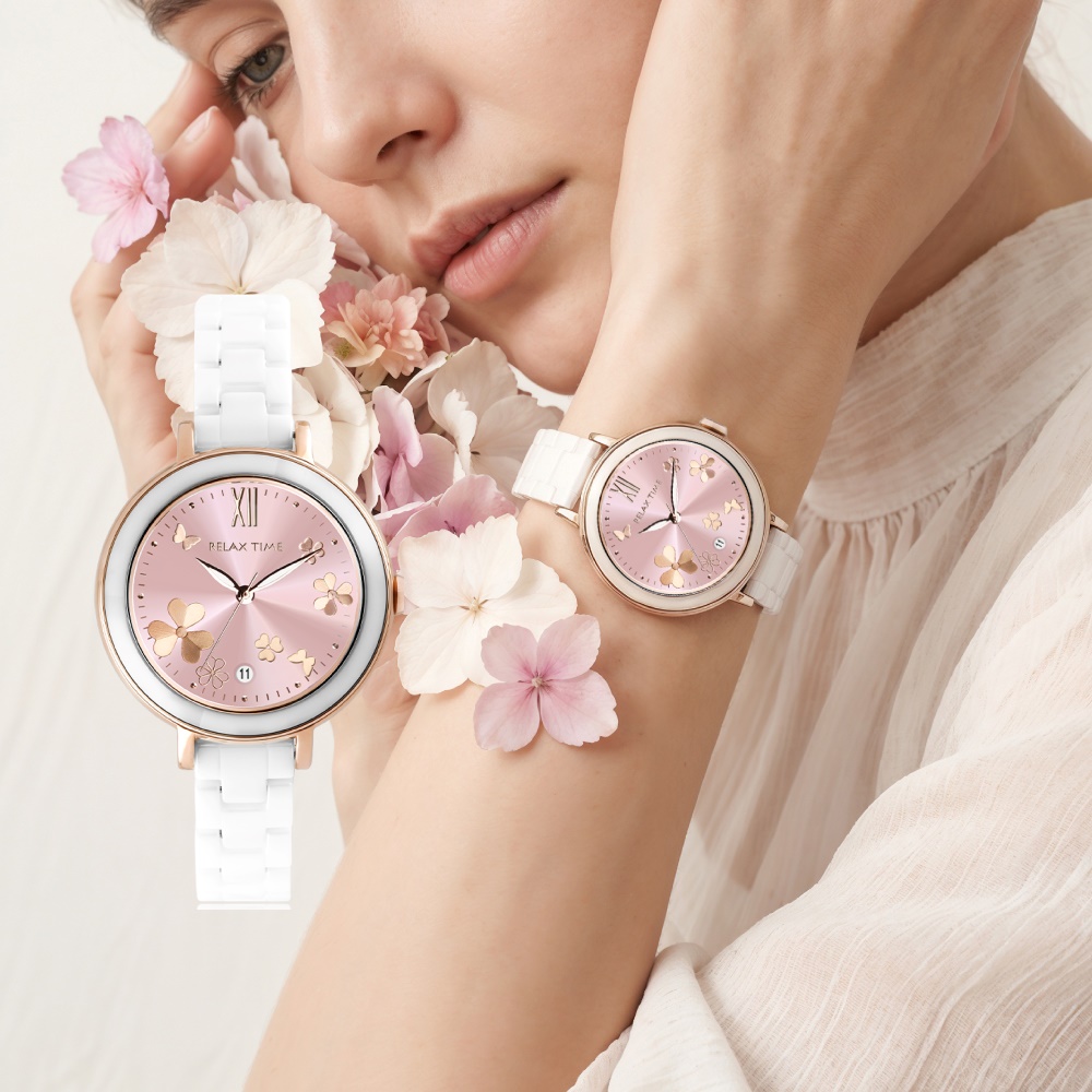 官網限定-1+1水晶熊手錶組合|RELAX TIME 拾光花語陶瓷系列-粉 (RT-122-02)