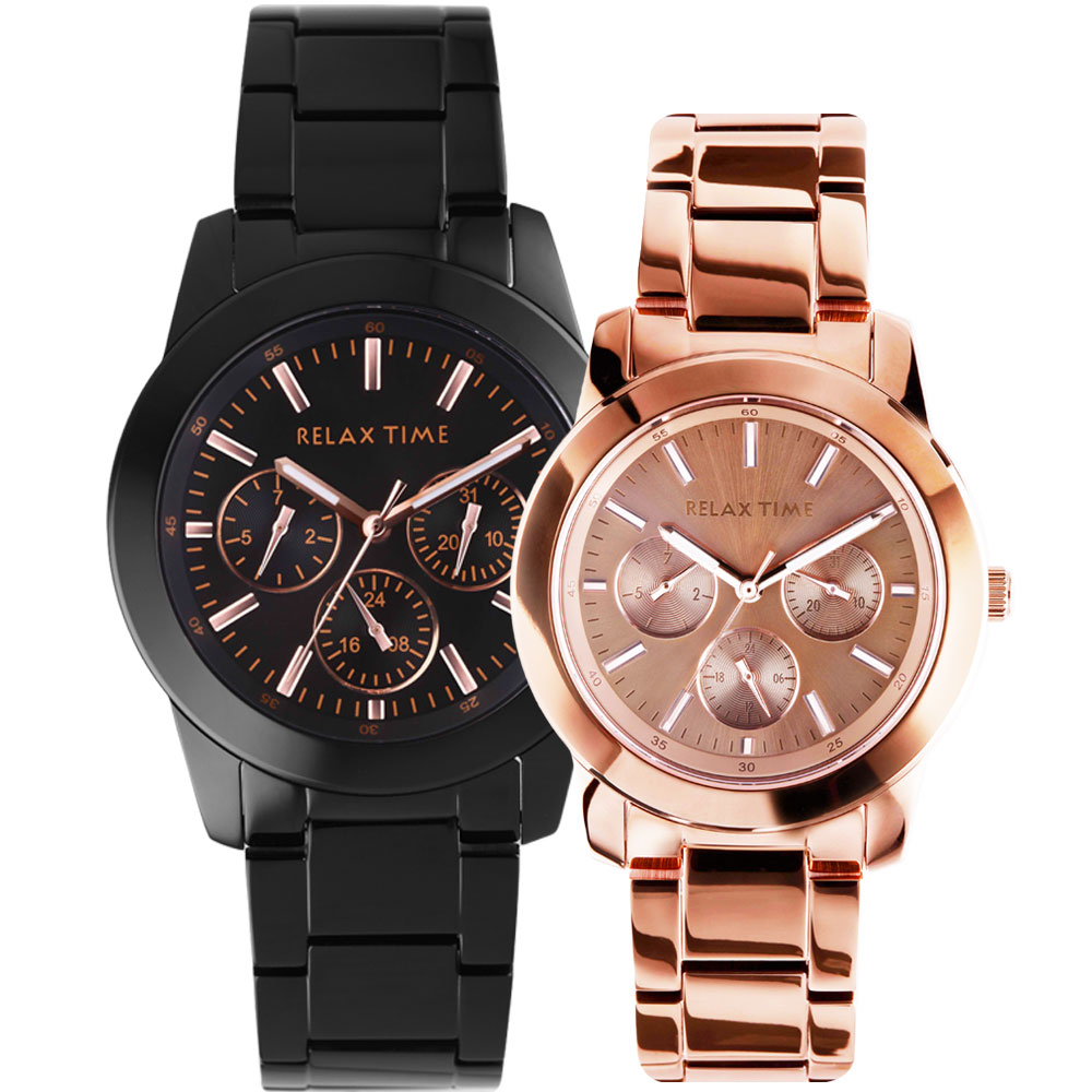 RELAX TIME 黑鋼三眼腕錶 [對錶組合] 黑鋼X玫瑰金 42mm+38mm